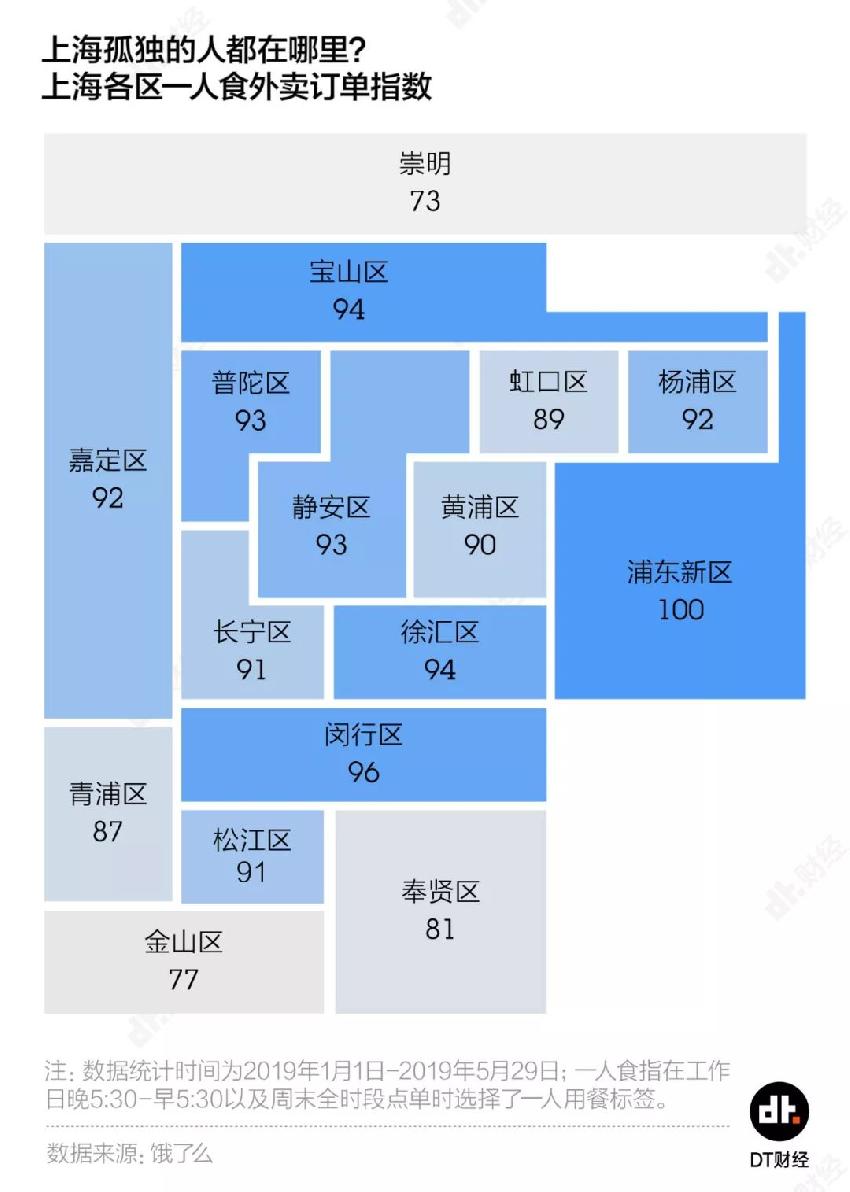聚集了一众金融与IT从业者的浦东新区,一人食外卖订单指数领跑全城,可以说是聚集了最多的孤独症患者。包裹在城市外围的闵行与宝山紧随其后,孤独实力也不容小觑。