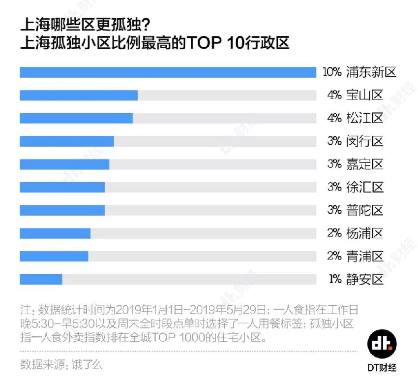 我们姑且认为,饿了么一人食外卖指数排进全市TOP 1000的小区,就算是站在城市孤独的顶端。而浦东新区每10个叫过外卖的小区中,就有1个上榜,比例遥遥领先于魔都众行政区,坐实沪上最孤独行政区无疑。