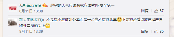 以往在这类话题中,针锋相对的是消费者本身该不该点外卖的道德讨论,今年,则出现了另一种声音:恶劣天气上商家应该暂停营业。